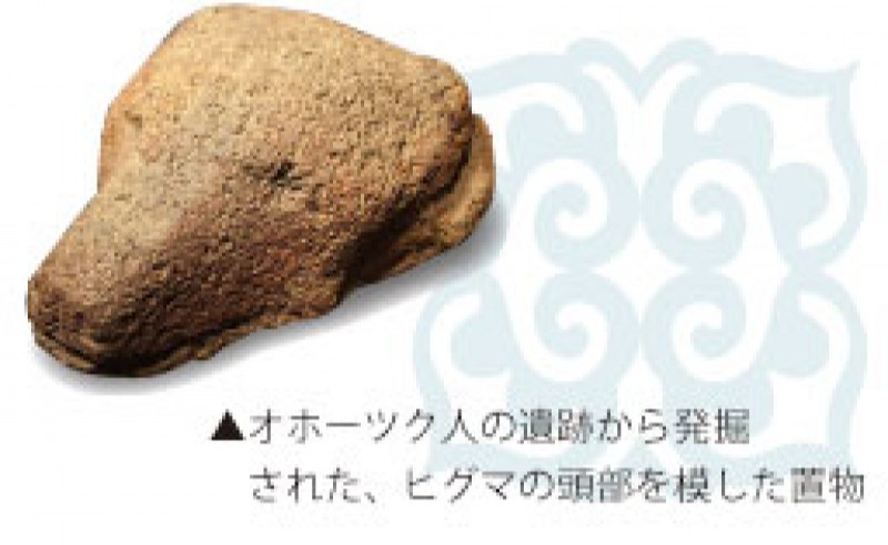 オホーツク文化は本州で考えると古墳文化の後期から奈良・平安時代の前期に渡って栄えたもの。交易民族という特異性からか、カラフトや奥尻にまで文化の痕跡が見つかっています。オホーツク人の身長は当時にしては高い160cmで短い手足を持った寒冷地対応の骨格。文化の特徴として埋葬方法が挙げられ、土葬後、墓石替わりのように頭の部分にツボを乗せる風習があります。これはオホーツク文化独自のもので、世界でも似た例は見つかっていません。また海岸近くに住みアザラシを好物としながら、熊を非常に重視する文化があったそうです。住居の中からは熊の頭部の模型をはじめ、いくつもの熊の頭の骨が見つかっているのです。